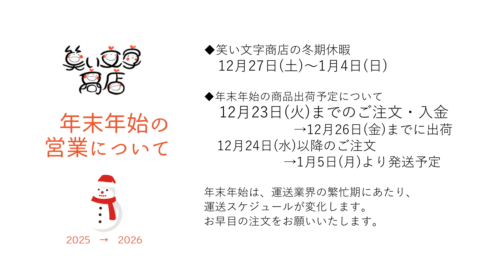 【2025年-2026年】年末年始の営業に関して 2025年12月4日 お知らせ 笑い文字商店 ※冬期休暇中の発注状況に応じ、発送が遅延する可能性が御座いますのでご了承ください。 ※12月24日(水)~12月26日(金)のご発注に関しましても発送準備が整った際には 上記期間に限らず準備出来次第発送を進めさせて戴きます。